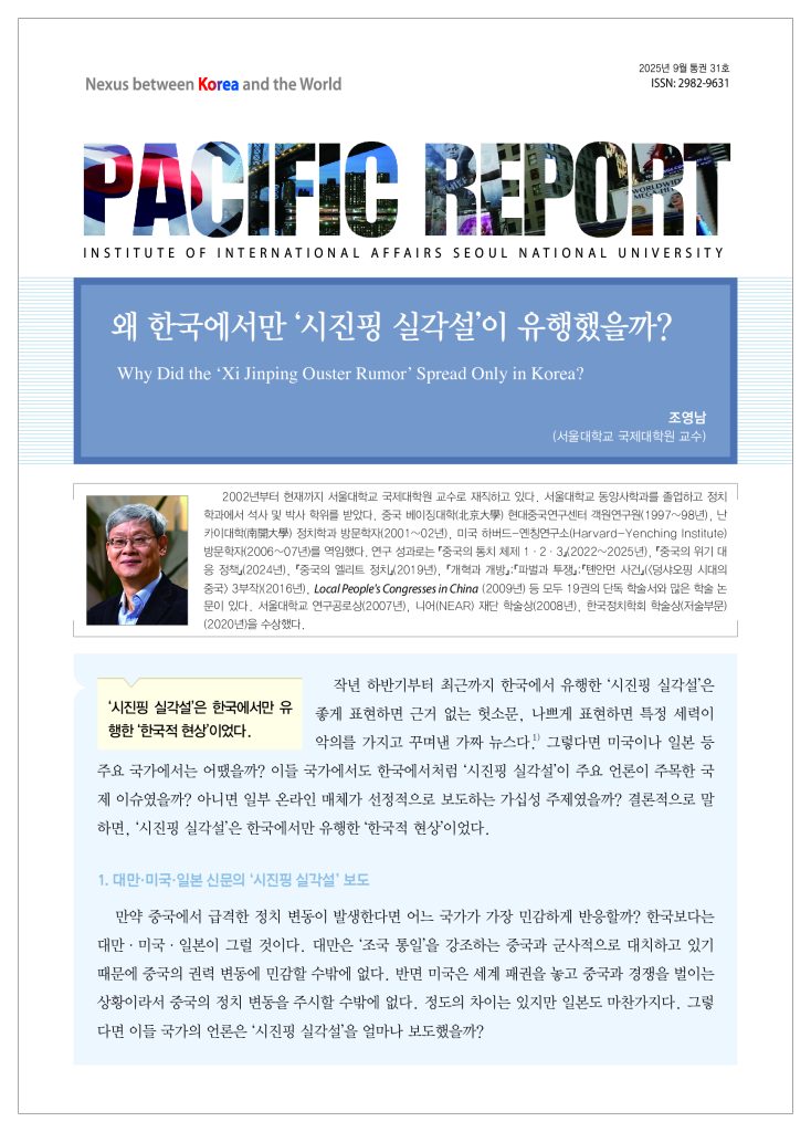 제31호에서는 <왜 한국에서만 ‘시진핑 실각설’이 유행했을까?>이라는 제목으로 조영남 서울대 국제대학원 교수가 기고하였습니다.