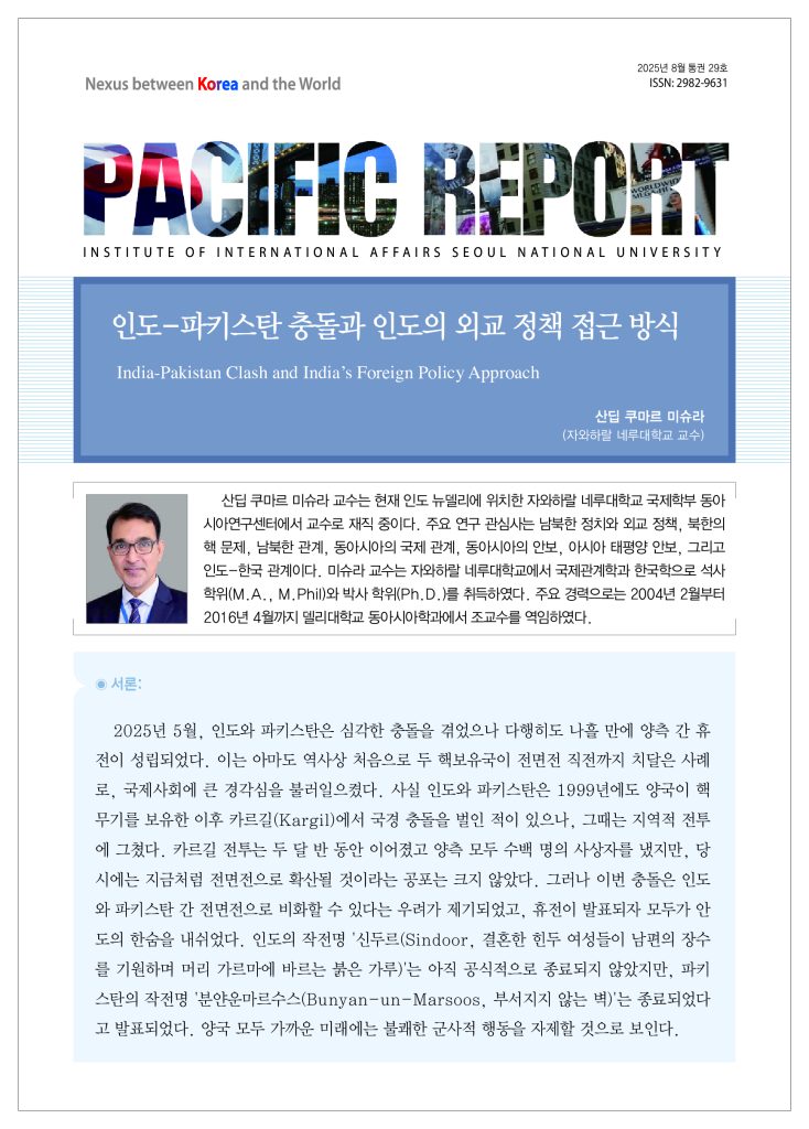 제29호에서는 <인도-파키스탄 충돌과 인도의 외교 정책 접근 방식>이라는 제목으로 자와하랄 네루대학교 산딥 쿠마르 미슈라 교수가 기고하였습니다.