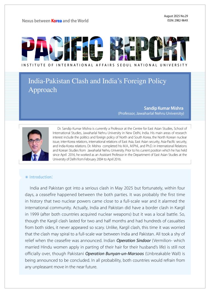 In this issue, Professor Sandip Kumar Mishra of Jawaharlal Nehru University contributed an article titled <India-Pakistan Clash and India’s Foreign Policy Approach>.